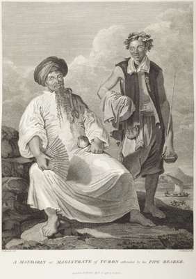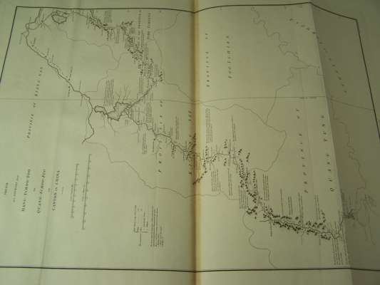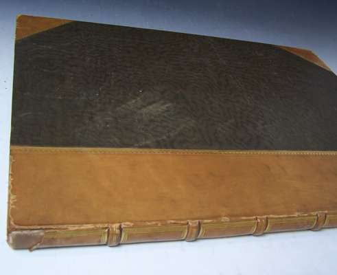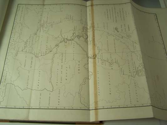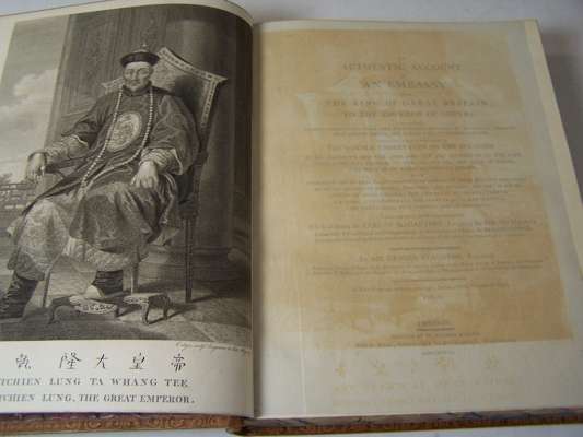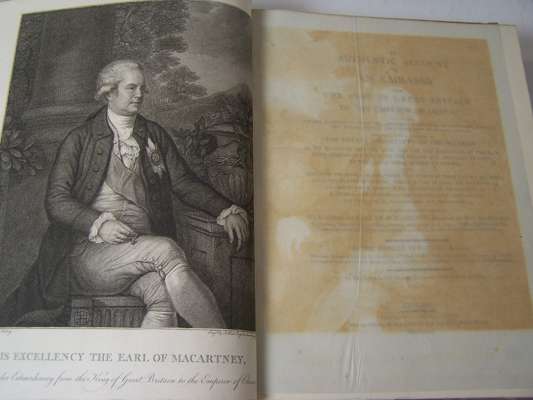An authentic account of an embassy from the king of Great Britain to the Emperor of China. London: G. Nicol, 1797. 2 volumes, 4to, [iii-iv, xxxiv, 518; xx, 626], text with 2 engraved frontispieces and 1 plate, atlas with 44 charts and plates, 7 folding and laid down on linen, text nineteenth century calf, atlas nineteenth century half calf, all volumes with Northern Lighthouse Board gilt stamp at head of spines, lacking half-titles, the folding plates browned at centre fold, some spotting, foot of spine chipped and worn, joints splitting