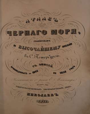 Atlas Chernago Moria. Nikolaev: Hydographic Department, 1841. Folio, engraved title, 26 double-page charts and 17 double-page coastal profiles, contemporary maroon morocco, gilt arms on sides, fore margins of title soiled, joints and corners worn, some tears and scrapes