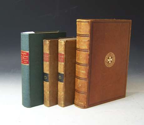 Coins and medals of the knights of Malta. London, 1908. 8vo, presentation copy from the author to Major General Spencer Ewart, plates, original morocco gilt, rubbed at edges, interior clean; Pinkerton, John An essay on medals. London, 1808. Third edition, 8vo, 2 volumes, contemporary calf gilt, red and black labels, some slight rubbing to edges, bookplates; Reports Seventh annual report of the General Board of Commissioners in lunacy for Scotland. Edinburgh, 1865 [bound with] The fourteenth report on the district, criminal and private lunatic asylums in Ireland. Dublin, 1865 [bound with] Report of the Directors of Convict Prisons on the discipline and management of Pentonville, Millbank and Parkhurst prisons.... also of the criminal lunatic asylum at Broadmoor. London, 1865. 8vo, later green cloth gilt (4)