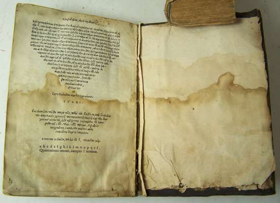 In priora analytica. Aristotelis commentaria. Venice: Aldus, 1520. 8vo, 141 leaves, woodcut Aldine device on title, later calf, waterstained, wormed at beginning with some loss of text to leaves 1-32, repairs and loss to title