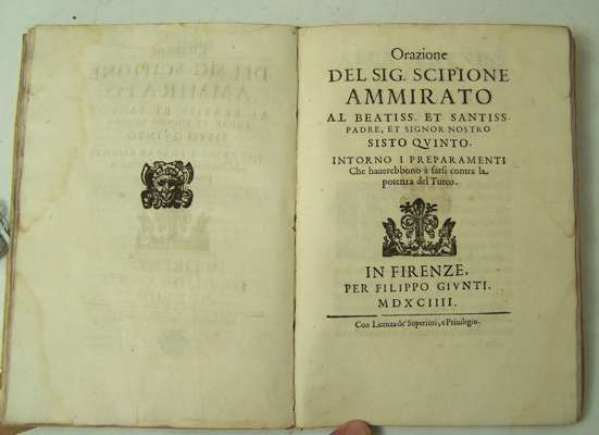 Lettere & orazoni... scritte à principi d'Italia intorno al collegarsi, et imprender guerra contro al Turco. Volgarizate dal Signor Filippo Pigafetta. Florence: Filippo Giunta, 1594. Woodcut device on title-page, woodcut initials; Ammirato, Scipione. Orazione... al beatiss. et santiss. padre, et signor nostro Sisto Quinto. Intorno i preparamenti che hauerebbono a farsi contra la potenza del Turco. Florence: Filippo Giunta, 1594. 4to, woodcut device on title-page, woodcut initials, 2 works in one volume, old vellum, margins of first two leaves slightly chipped, some dampstaining throughout, binding slightly worn
