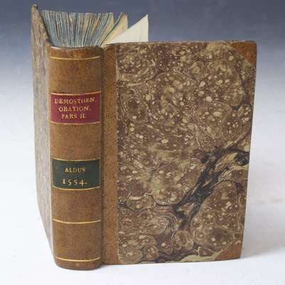 Orationum pars secunda. Venice: Paulo Maunutio, Aldi filio, 1554. 12mo, part 2 only, Aldine woodcut device on title, woodcut initials, nineteenth century half calf, [Adams, D264], slight worming to a few lower margins at beginning and end just touching a few letters, slight spotting and staining; [Hertel, Jakob] Vetustissimorum et sapientiss. comicorum quinquaginta. Basle. [J. Oporinus ?, 1560]. 8vo, contemporary vellum, occasional spotting; Hermogenes, the Rhetorician. Ars oratoria absolutissima... commentaris Gasparis Laurentii. Geneva: P. Aubert, 1614. 8vo, later calf-backed boards, somewhat spotted, head of spine worn; Andronicus Rhodius Ethicorum Nichomacheorum paraphrasis. Cambridge: J. Hayes, 1679. 8vo, Greek and Latin text, 19th century vellum, some spotting; Palaephatus. De incredibilibus. Cornelius Tullius... notis illustravit. Amsterdam: L. Elzevir, 1649. 12mo, woodcut device on title, contemporary vellum (5)