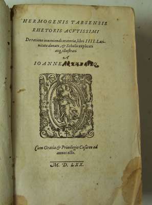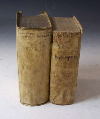 Hermogenis Tarsensis rhetoris acutissimi de ratione inueniendi oratoria, libri IIII. Argentorati : Excudit Iosias Rihelius, 1570. 2 parts in one volume, 8vo; Idem De ratione tractanda gravitatis occultae liber. Argentorati: Excudebat Iosias Rihelius, 1571; Idem Ioannis Sturmii scholae in librum Hermogenis de ratione tractandae gravitatis occultae. Argentorati: Excudebat Iosias Rihelius, 1571, 3 works in one volume, woodcut device on titles, contemporary vellum, small inkstain to a few fore margins of first work, loss to head of spine and part of lower cover; Quintus Calaber [Greek text] Ilias Kointu Smyrniau; seu Quinti Calabri paraleipomena, id est, derelicta ab Homero, XIV libris.. correcta a Laurentio Rhodomano. Hanover: Typis Wechelianis apud Claudium Marnium & heredes Ioannis Aubrii, 1604. 8vo, 3 parts in one volume, contemporary vellum, minor worming to last five leaves (2)