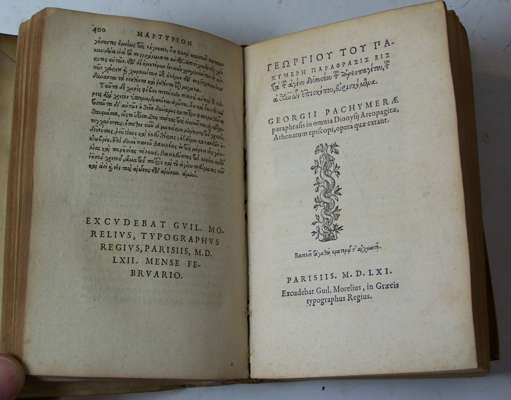 Scholia in eos B. Dionysii libros qui extant. Michaelis Syngeli laudatio eiusdem. Paris: Guil. Morelium, in Graecis typographum Regium, 1562. 12mo, [26], 400; strip excised from head of title; Pachymerae, Georgius Paraphrasis in omnia Dionysii Aeropagitae, Athenarum episcopi, opera quae extant. Paris: Guil. Morelium, in Graecis typographum Regium, 1561. 12mo, [xii], 444, 2 works in one volume, contemporary vellum, hinges broken