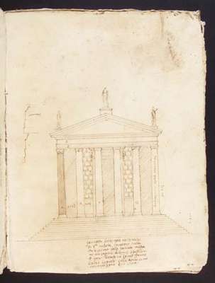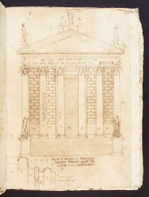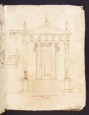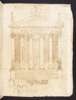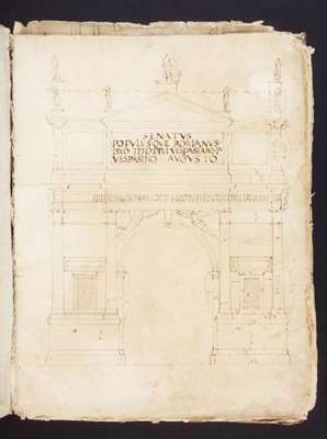 The Codex Stosch was probably bound together shortly after the death of their first known owner, Philipp von Stosch, in 1757. Winckelmann referred to these drawings in print in 1762, believing them to be Raphael's lost reconstruction of ancient Rome, proposed in his famous letter to Pope Leo X. This letter dates from between 1515 to 1519, and the project was underway before his death in 1520. In fact all are by Giovanni Battista da Sangallo (1496-1548), strongly resembling the drawings he made to illustrate a first edition of Vitruvius, now in the Biblioteca Corsiniana, in Rome. These are usually dated to the 1520s and later, but the present drawings may be a few years earlier. Nearly all the drawings find parallels among those of Antonio da Sangallo the Younger (1484-1546), Giovanni's brother, who was appointed Raphael's chief assistant for the building of St Peter's in 1516. Even if the drawings in the Codex Stosch cannot directly be connected with Raphael's reconstruction, they give us a very strong impression of what it would have looked like.