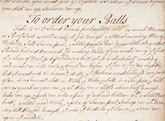 Note: Recipes include: To order your Balls; To make a Friggasy of Young Rabbets, To make a dish of Puffens, To make a Green-pease soop, To make a dish of Allamode of Pippin Chickens, To make a Cumport of wild Fowl, To make Orange Marmalet and To make Almond Jumballs