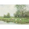 DUCKS AND DUCKLINGS BY A RIVERBANK