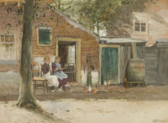GIRLS KNITTING BY THE KITCHEN DOOR