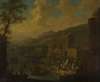 A BUSY RIVERSIDE PORT WITH FIGURES AND BOAT BY THE QUAY
