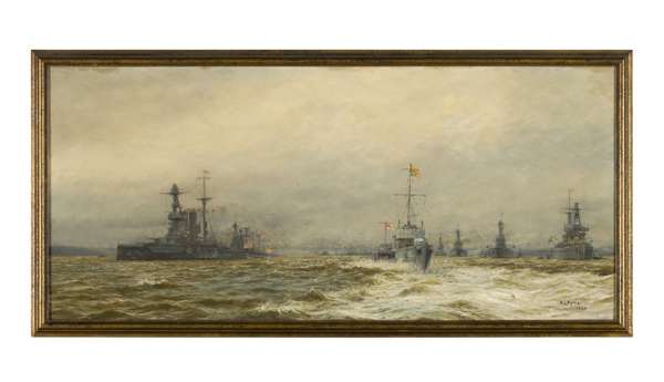 The painting offered here is a large, exceptional example, combining to great effect the elements that ensure his work has such great and enduring appeal. The Royal Standard is raised high, denoting an occasion of significance, and the iconic Forth Rail Bridge, visible in the background, places us in the Firth of Forth. The choppy green waves are meticulously described and we, the viewer, appear to look back from the stern of a ship observing a fleet of battleships follow in our wake.