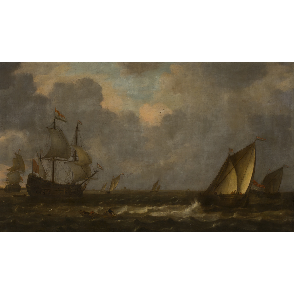MAN OF WAR, FISHING BARGES AND ROWING BOAT IN ROUGH SEAS