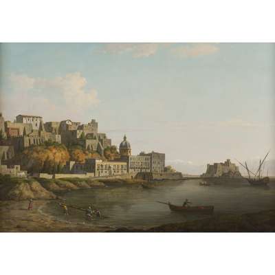 His view of the Bay of Naples takes a closer viewpoint than that chosen by many artists and offers an intimate portrait of one of the Grand Tour's cultural metropolises. The central focus is the dome of Santa Maria degli Angeli at Pizzofalcone. Like Vernet before him in the 1740s, Marlow adds vignettes of fishermen drawing in their nets and a fishing boat and it is possible that Marlow might have known the French artist's hugely successful views of the bay.