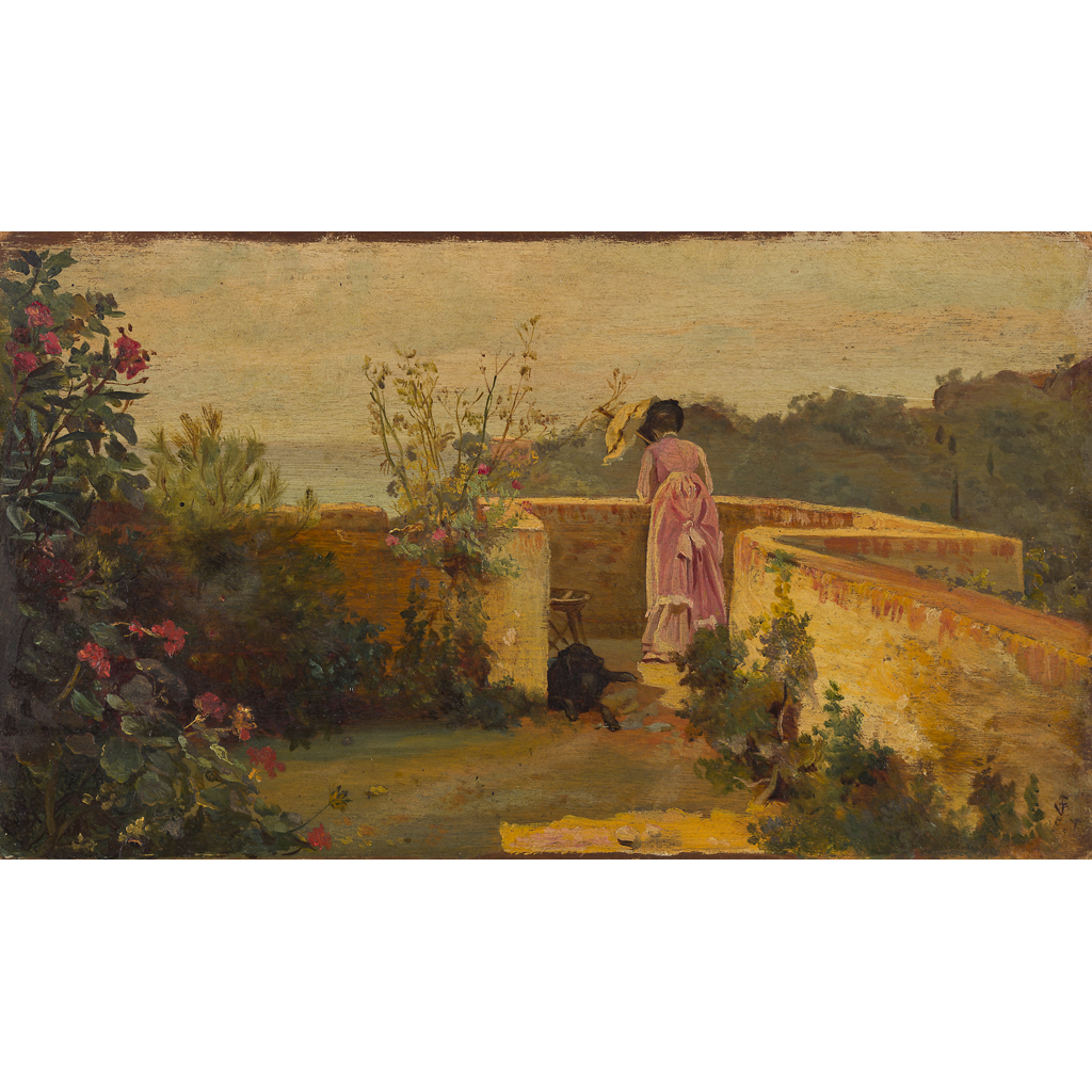 Note: Painted before she became Lady Butler, this charming small-scale oil on panel study captures a sense of Elizabeth Thompson's youthful talents, particularly her eye for composition, painting the land where she spent much of her childhood. Here, she depicts the informal moment of an elegant lady luxuriating in the lush surroundings and views of her Genoese garden, accompanied by a faithful canine companion.