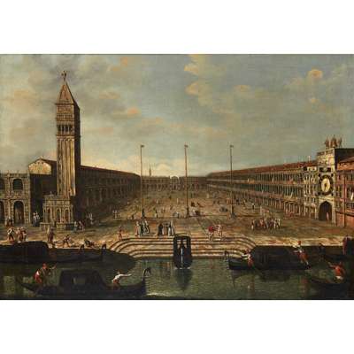 In this skilfully handled capriccio, the artist depicts a fantastic vision of Piazza San Marco, with a focus on a dramatic and sweeping view from a raised point, replacing the basilica itself with a canal. This perspective creates an expansive feeling and shows the particular influence of Michele Marieschi, who had a very short but successful career as a painter and engraver, and was known for his views of Venice, publishing a set of 21 prints of the city, as well as his oil paintings.