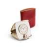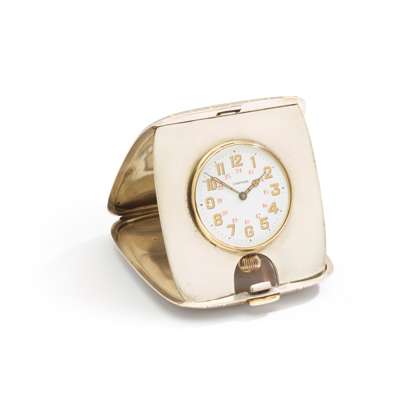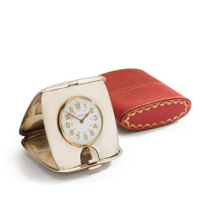 Jewelled mechanical hand-wound movement, white enamel dial with painted numerals and inner red 24 hours, painted skeleton hands, hinged inner, hinged clam-form silver case with inlayed contrasting stripes, blank cartouche, dial and movement signed Cartier, maker's mark GD, dimensions when closed 82mm wide x 89mm deep x 18mm high.