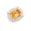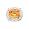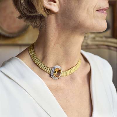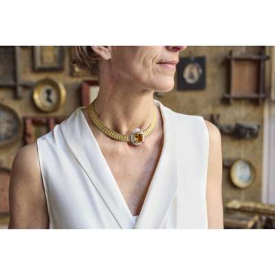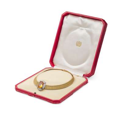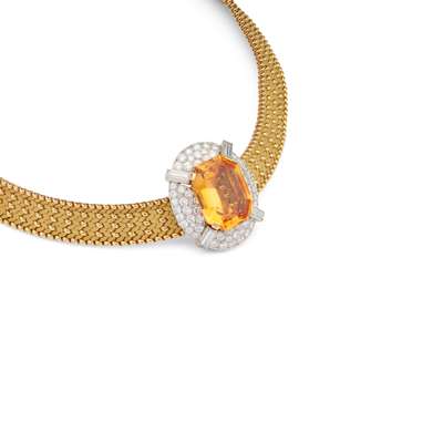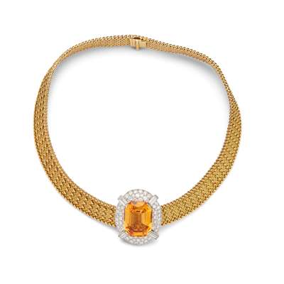 The 18 carat gold necklace of polished and matte woven design in a herringbone pattern, featuring a detachable spacer that converts into a brooch, centrally set with a step-cut topaz, each of the four claws buttressed by a baguette-cut diamond, within an oval angled surround pavé-set with brilliant-cut diamonds, diamonds approx. 4.50 carats total, topaz approx. 24.50 carats, necklace signed Cartier, partial maker's mark GL for Georges Lenfant, numbered, maker's mark JC and London import mark, French export marks, brooch unsigned, lengths: necklace 37.3cm, brooch 3.3cm