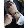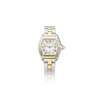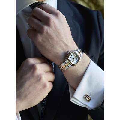 Quartz movement, two-tone silvered dial, with black Roman numerals, luminous hands, date aperture, stainless steel tonneau shape case with gold bezel, on steel and gold Cartier bracelet with double folding clasp. Case, dial and movement signed. Dimensions 31 x 37mm.