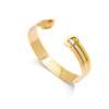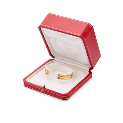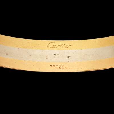 The rigid cuff of 18 carat white, yellow and rose gold, to terminals of polished gold ‘C’s, signed Cartier, numbered, European assay mark, Swiss assay mark, inner diameter 5.8cm