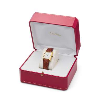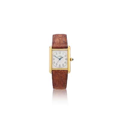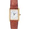 Quartz movement, white dial with repeated double C logo, plain white chapter ring with grey numerals, date aperture, blued steel hands, centre seconds, gold-plated silver rectangular case, cabochon-set crown, on brown strap with gilt stainless steel adjustable Cartier deployant buckle. Case, dial and movement signed Cartier. Width 26mm.
