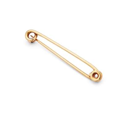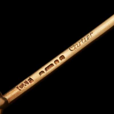 Designed as a 9 carat gold safety pin, signed Cartier, maker's mark C&F for Cropp & Farr, London hallmark, length 4.5cm