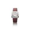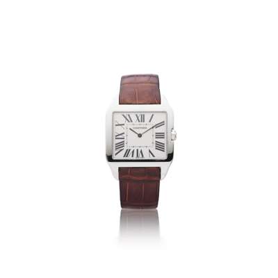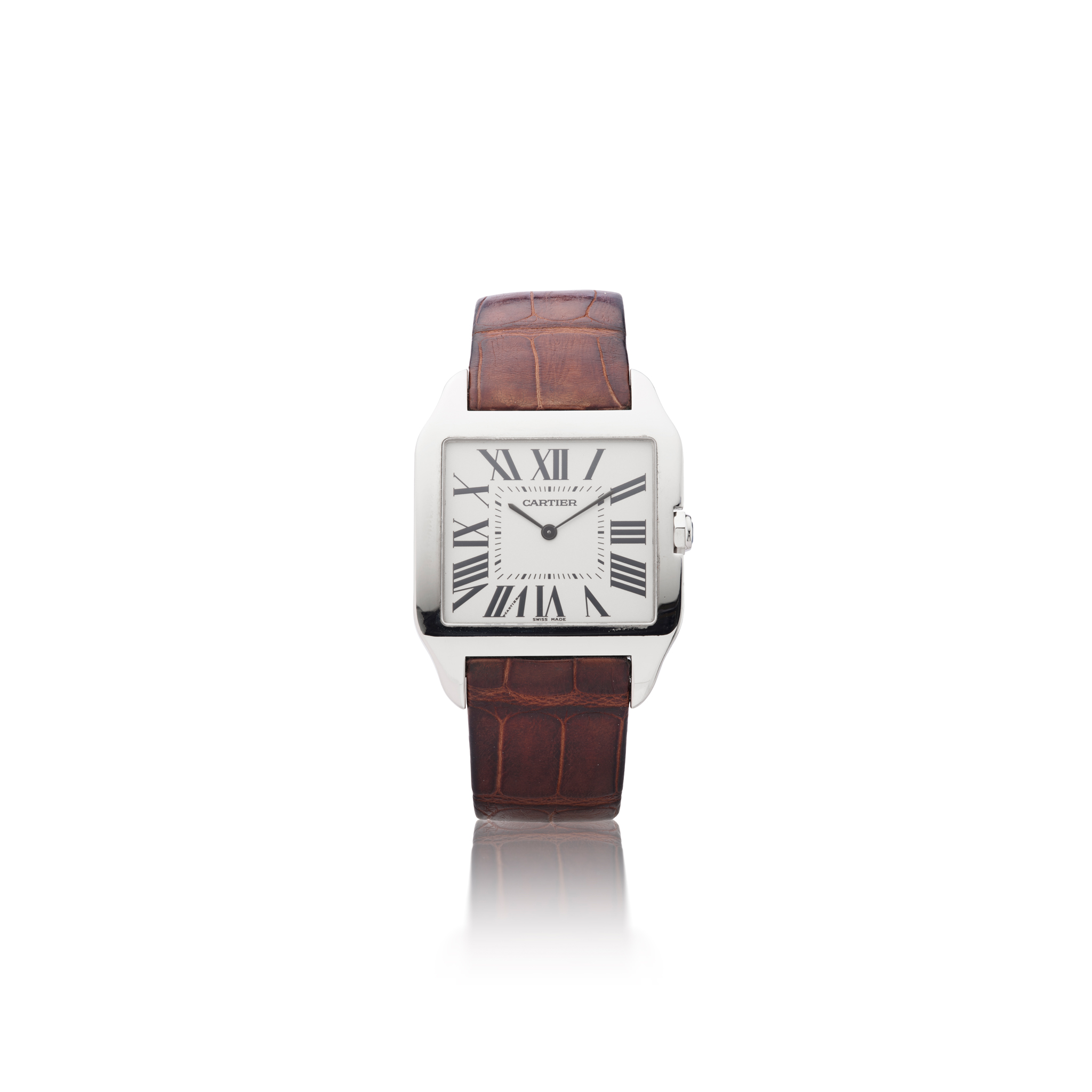 Hand-wound mechanical movement, silvered dial with black Roman numerals, blued steel hands, 18 carat white gold square case, cabochon-set crown, on brown Cartier strap with 18 carat white gold Cartier adjustable deployant clasp. Case, dial and movement signed Cartier. Width 35mm.