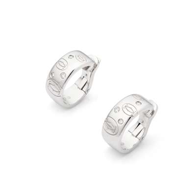 Each polished hoop, engraved with the double C logo, gypsy-set with brilliant-cut diamonds, signed Cartier, numbered, post and rotating clip fittings, length 1.9cm