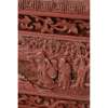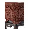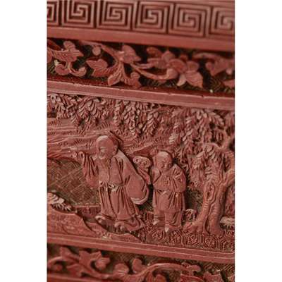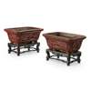 each of rectangular section and supported on four short feet, the everted rim decorated with shou characters at the top and key-fret scroll on the edge, the exterior walls carved with four panels each depicting an elderly scholar and attendants within a landscape, framed by meandering peony scrolls, the interior and the base lacquered black, with wood stands (2)