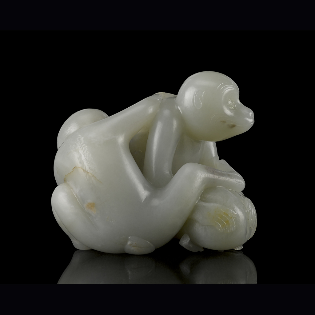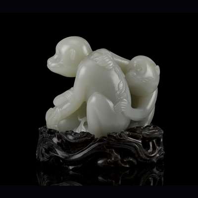 A similar carving but of a single monkey holding a peach was sold at Sotheby's London on 6th November 2013, lot 28. A carving of similar large size and subject matter is illustrated in Robert Kleiner: Chinese Jades from the Collection of Alan and Simone Hartman, Hong Kong, 1996, pl. 188 and sold at Christie's Hong Kong on 27th November 2007, lot 1557.
