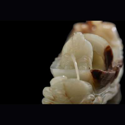 carved in the form of a flat-bottomed boat above swirling waves, the bow covered with a rounded rattan roof, at the prow a seated fisherman angling, two fishing baskets at the stern, the stone of pale celadon colour with a few patches of calcified brown inclusions and russet veins