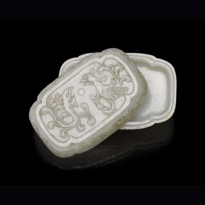 of quadrilobed form, decorated to show twin phoenix to cover top and edge, wrapped with lappet design to the rim, the jade of translucent quality