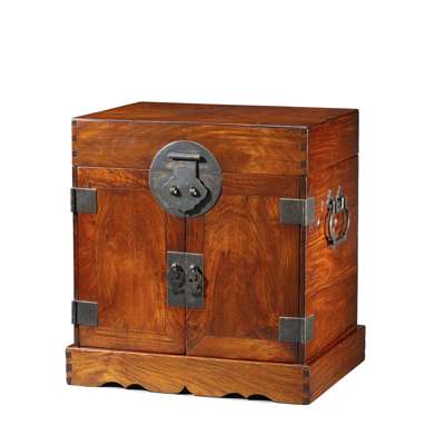 of tall rectangular form, with stylised base apron and original metal hardware and hasp
