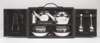 manufactured by Hukin and Heath, silver plate, comprising: a kettle and cover, 9cm high; a teapot and cover, 8cm high; a tea caddy and cover incorporating paraffin burner and stand; a milk jug; a sugar bowl; a milk flask and cover; two teaspoons; a pair of sugar tongs; each bears crest, stamped marks 'H & H 2110' also with retailers mark 'Leuchars & Son, London and Paris', and two blue and white Royal Worcester cups and saucers, contained within a leather-covered fitted case