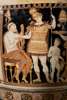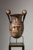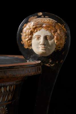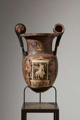 painted ceramic, the body painted in front with four figures in a naiskos – a seated bearded man clasps the hand of a standing warrior holding a spear, small boy with situla, bearded man holding a phiale, to the left a seated youth holding an alabastron and stick, a woman bending forward holding an open box, to the right a further lady and youth, the neck adorned with a female head in three quarter, the mascaroons with female heads wearing diadems, accompanied by an ancient painted stand and a modern metal and stone plinth