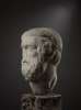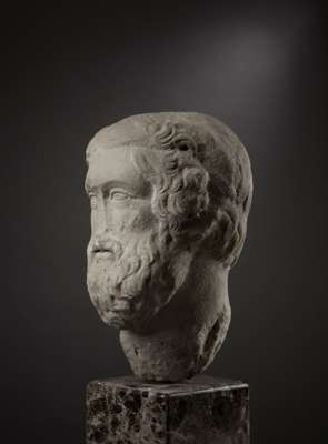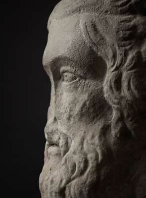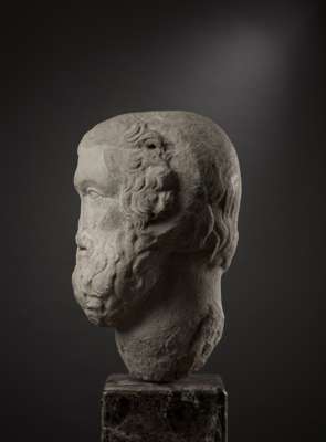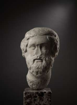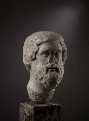 carved marble, depicted with a broad neck, the head turned subtly to the right, with the gaze fixed to the side, the pupils drilled, the lips slightly parted, with thick curly beard, wavy hair and rams horns curling around each ear, raised on a bespoke mount.