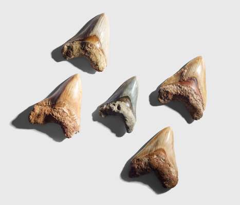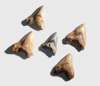 a collection of five Otodus megalodon teeth, all with fine serrations