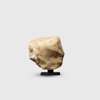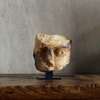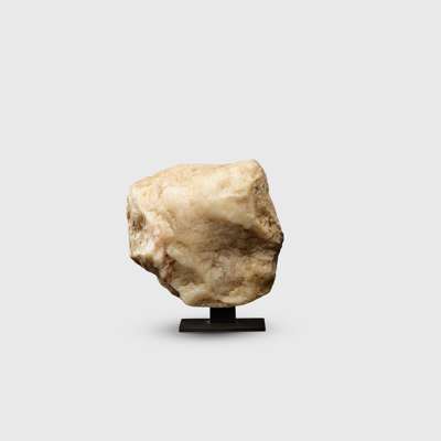 carved alabaster, a fragment, representing a male head, the eyes framed and the pupils drilled and originally inlaid, with deep brows and a broad triangular nose, raised on a bespoke mount