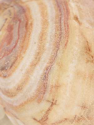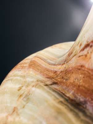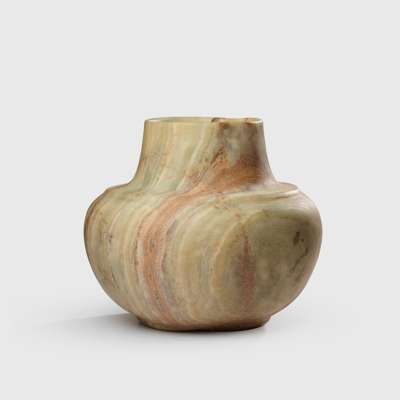 carved banded alabaster, standing on a rounded base, the curved body leading to a broad neck with thin rim