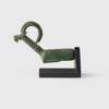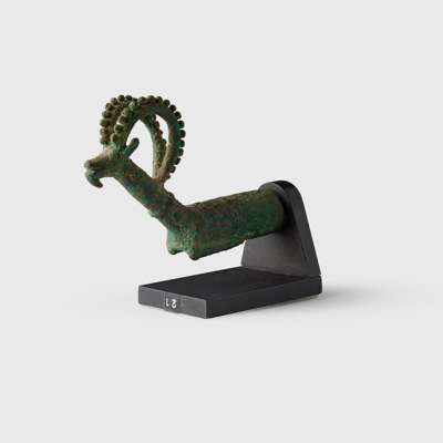 cast bronze, in the form of a recumbent ibex, its legs tucked beneath its body, the horns looping round to form a semi-circle with the back of the neck, raised on a bespoke wooden mount