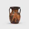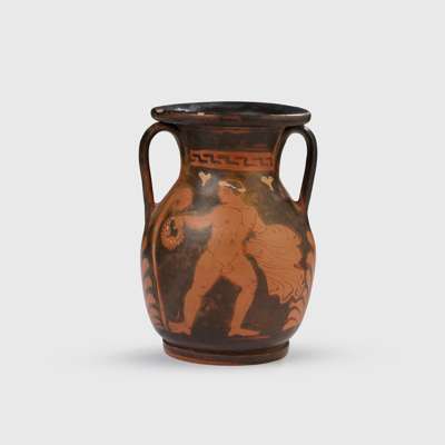 the globular body decorated with a woman to one side and a young man to the other, each holding a tympanum, with palmettes under the two handles