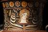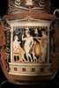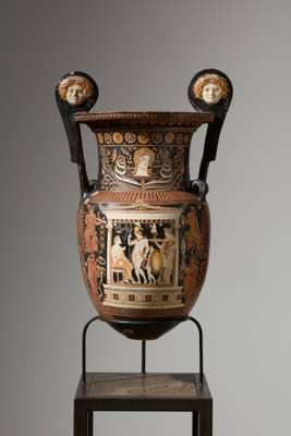 painted ceramic, the body painted in front with four figures within a naiskos, a seated bearded man, helmeted warrior holding a spear and sheathed sword, a boy carrying a shield and a woman holding a phiale to the left, a seated woman with phiale and rosette-chain, youth with wreath, phiale and fillet; to the right a seated youth with oenochoe, a woman bending forward with phiale, patera and wreath, the neck adorned with a laurel-wreathed head, possibly Apollo within a floral setting, the mascaroons with female heads wearing diadems