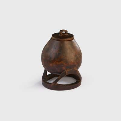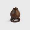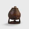 carved wood, standing on a ring base, the rounded container raised on two arches, separate lid with looped handle, rich patina