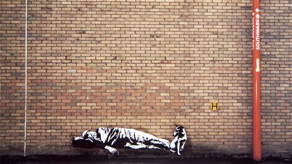 The use of the image of a Beggar sleeping rough appears throughout Blek's work and develops out of the artist's conviction that urban art can be used as a tool to influence social action by emphasising certiain relevant social issues.