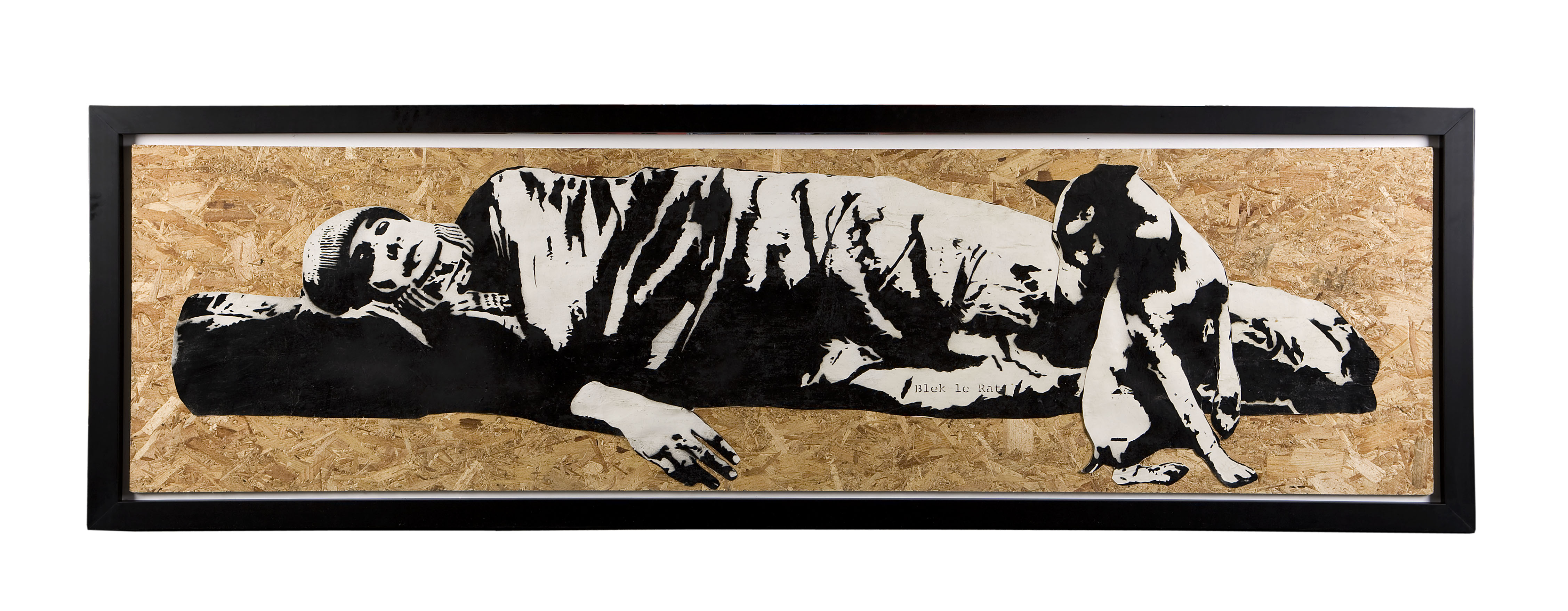 This work is an original stencilled paste-up which appeared on a now demolished wall in Southwark near Tate Modern in 2007. It is illustrated in Thames & Hudson's book, 'Blek le Rat, Gettting Through the Walls', published by in 2008, page 113.