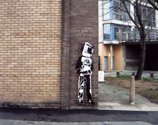 The image of a computer headed man developed in 1991 when the artist was in New York and saw a man walking down the street with a cardboard television over his head. This was later morphed into a computer since these play such an important part of Blek le Rat's life and artistic practice.