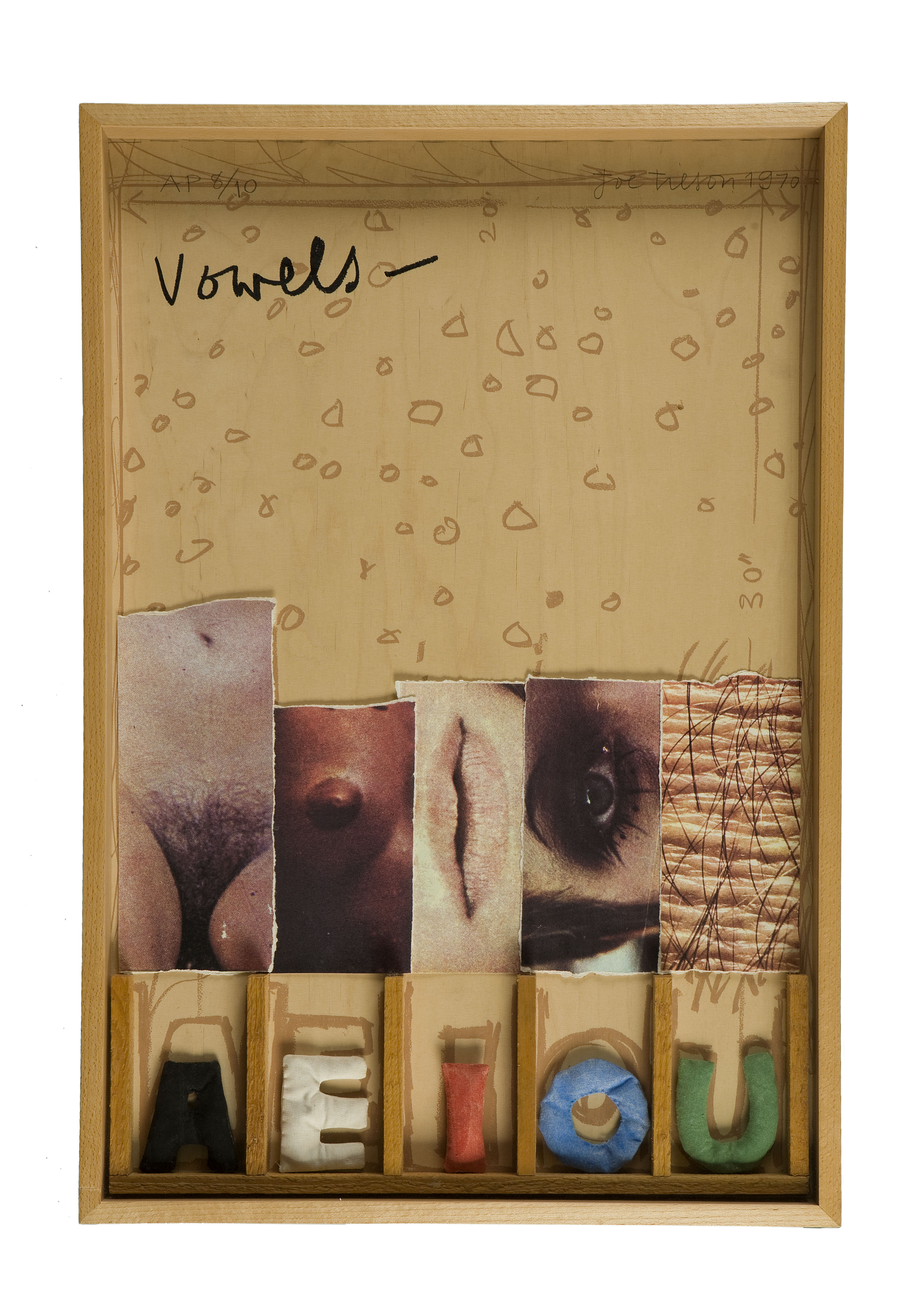 Screen-print with collage and fabric letters on wood, signed and dated 1970, numbered AP 8/10