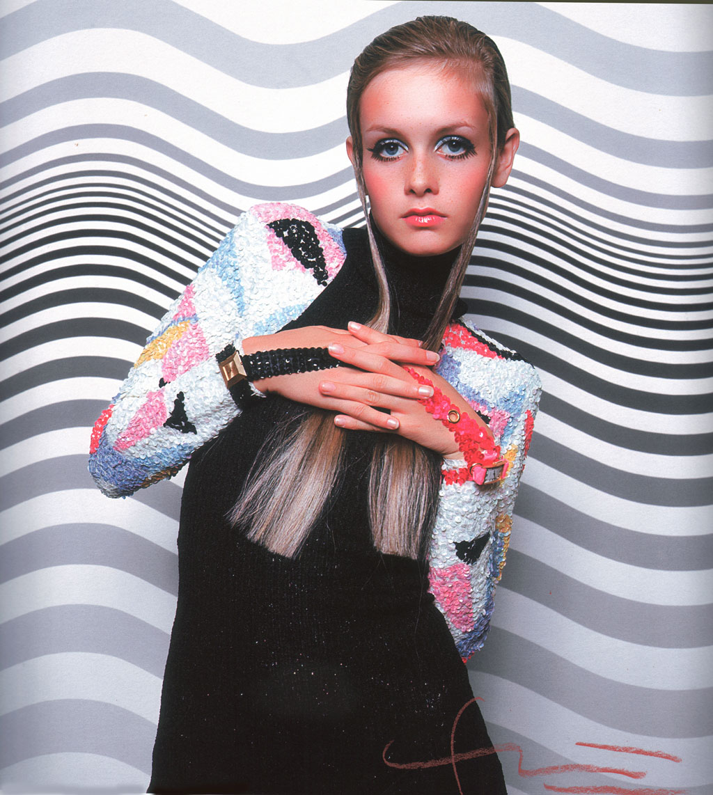 TWIGGY IN FRONT OF BRIDGET RILEY PAINTING