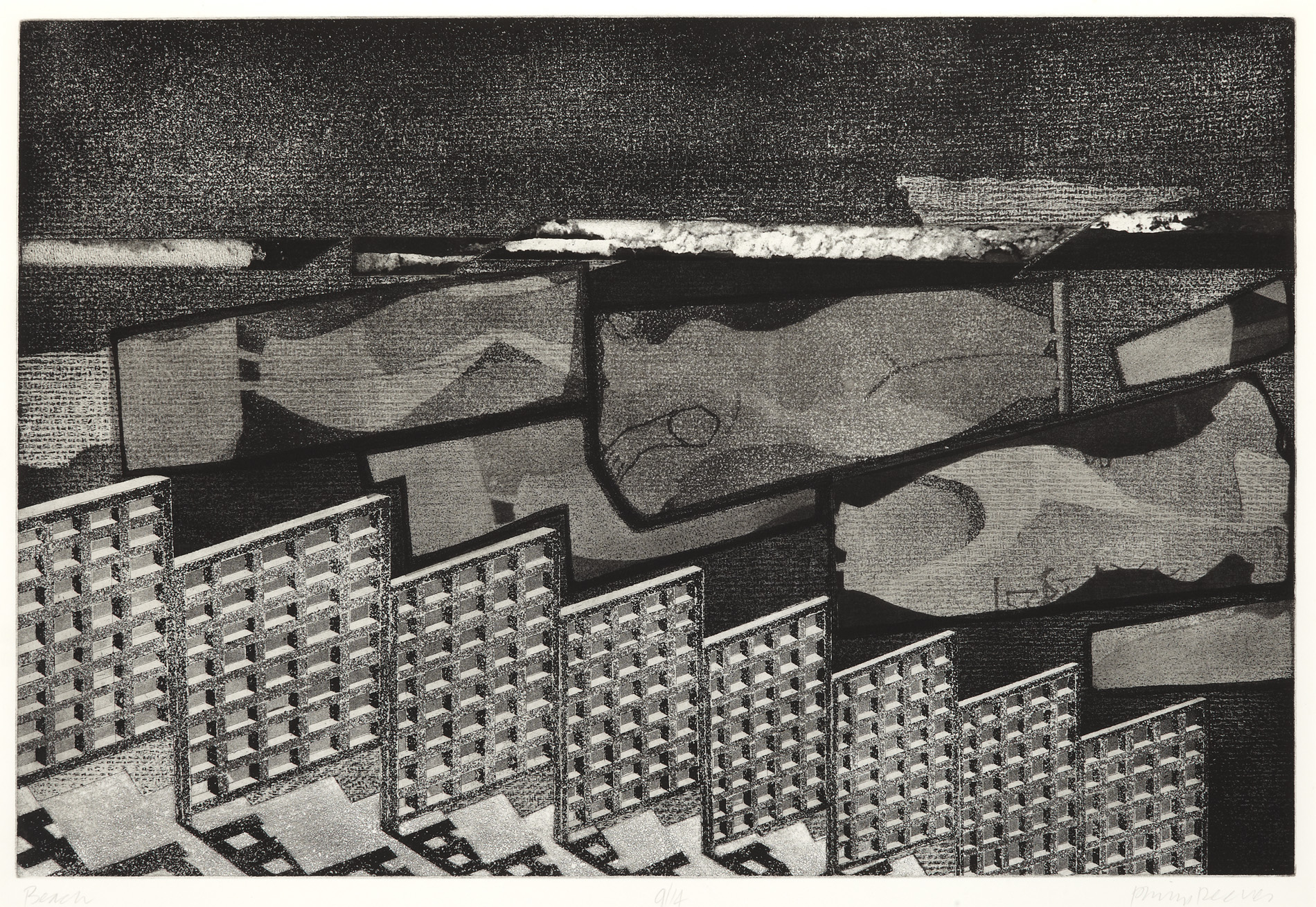 Note: The foreground features steps leading down to the beach where three ladies are sunbathing. The inspiration for this strangely surreal print came from a beach in Northumbria.