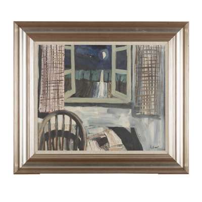 Some cracking /paint lifting and associated small loses. Notably to moon, and sky left of moon. Also to upper right corner and window sill above chair.