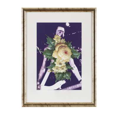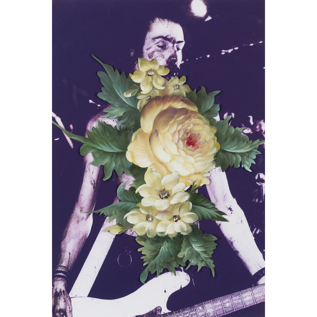 The piece represented here for sale is emblematic of one of Lambie's core themes: his love of music and his interest in conveying what he sees as the symbiotic relationship between both artistic mediums. Collage and embellishment play a recurrent role in his practise and he takes pleasure in exposing the mechanics of his process to his audience. The work is part of a series which juxtaposes images of famous rock stars with anachronistic, finely painted floral motifs in oils. Here we see them figuratively blossoming out of the mouth of Sid Vicious, the ill-fated punk musician of the Sex Pistols. Iconoclastic but light-hearted; it is a thing of beauty, black humour and a sincere homage to a rock'n'roll idol.