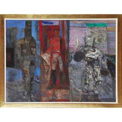 In this important and monumental work in Philipson's oeuvre, the artist addresses the theme of the Great War, rather than that in which he had served himself (WW2).